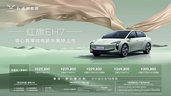 3月20日,紅旗新能源在深圳市民廣場舉行“安心駕享·紅旗EH7上市發(fā)布會”,紅旗新能源品牌首款戰(zhàn)略車型——“安心駕享純電轎車”紅旗EH7正式發(fā)布,全國統(tǒng)一零售價為22.98萬-30.98萬元,特別推出的“零壓安心享”計劃,紅旗EH7用戶最高可享價值10萬元的權益。[