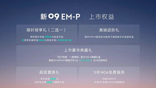 此外,新09EM-P大定用戶還可獲得“百萬熱愛·一路潮前”新09EM-P典藏禮盒(上市豪華典藏禮),內(nèi)含魅族INFINITY旗艦手機(jī)1臺(12G+256G)及09定制周邊,同時(shí)可享受新09EM-P副駕多功能電子遮陽板半價(jià)選裝權(quán)益(高端進(jìn)階禮),本品牌8,000元或其他品牌6,000元置換/增購補(bǔ)貼(超級置換禮)及5年免費(fèi)NOA訂閱服務(wù)。