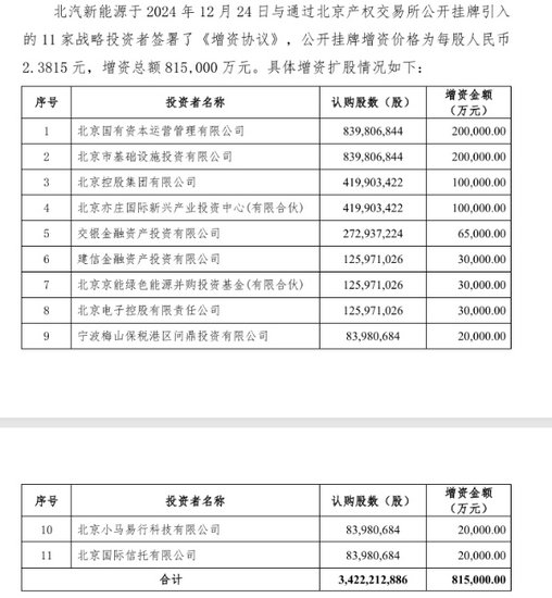 公告中顯示,此前,北汽新能源已于2024年12月13日與北京汽車股份有限公司(以下簡稱“北京汽車”)簽署了《增資協(xié)議》,北京汽車以非公開協(xié)議方式向北汽新能源增資20億元。北汽新能源本輪以非公開協(xié)議增資及公開掛牌增資總額合計為101.5億元。