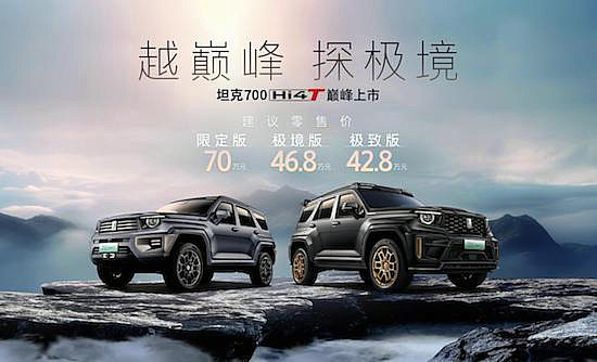 越巔峰,探極境。2月26日,“中國豪華越野旗艦”坦克700 Hi4-T發(fā)布上市,坦克700 Hi4-T限定版建議零售價70萬元,極境版建議零售價46。8萬元,極致版建議零售價42。8萬元。