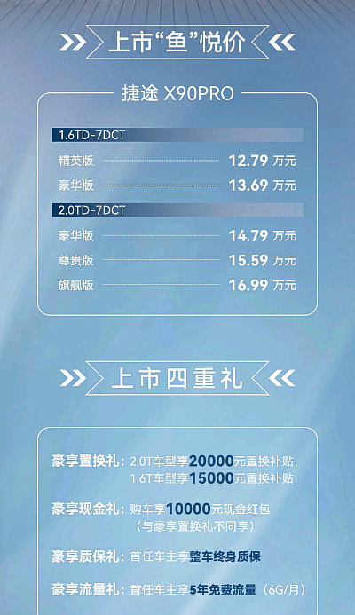 活動現(xiàn)場,捷途汽車推出旗下全新產(chǎn)品——捷途X90PRO,新車推出2。0TGDI-7DCT、1。6TGDI-7DCT兩種動力組合,共計5款車型,官方指導(dǎo)價12。79萬元-16。99萬元。作為大家庭大七座旗艦SUV,捷途X90PRO集強(qiáng)動力、大空間、高科技、高顏值于一身,專為追求實用與品味的大家庭用戶設(shè)計。為回饋用戶,捷途汽車此次推出包括最高20000元的置換補(bǔ)貼、萬元現(xiàn)金紅包禮、終身質(zhì)保以及5年免費6G/月流量包等多項上市權(quán)益,全方位提升用戶體驗。