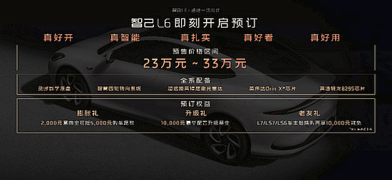 當(dāng)日,智己L6正式開(kāi)啟預(yù)售,預(yù)售價(jià)格區(qū)間:23萬(wàn)元~33萬(wàn)元。智己L6 Max標(biāo)準(zhǔn)版,不超過(guò)23萬(wàn)元;智己L6 Max超強(qiáng)性能版,不超過(guò)29。99萬(wàn)元;智己L6 Max光年版,不超過(guò)33萬(wàn)元。同期,也公布了極具誠(chéng)意的“限時(shí)預(yù)訂權(quán)益”,2000元意向金即可抵5000元購(gòu)車(chē)尾款,以及10000元豪華配置升級(jí)基金。