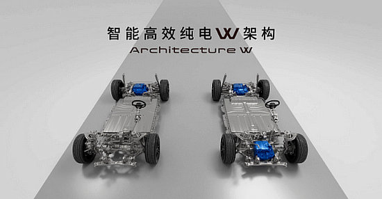 “W”架構提供單電機后輪驅動和雙電機四輪驅動兩種驅動形式。其中,單電機后輪驅動依靠高功率后驅電機,實現(xiàn)前后50:50的重量分配;雙電機四輪驅動依靠前后兩組高功率驅動電機,搭配電子懸架,并根據(jù)不同路況和駕駛需求,精準分配前后輪動力。