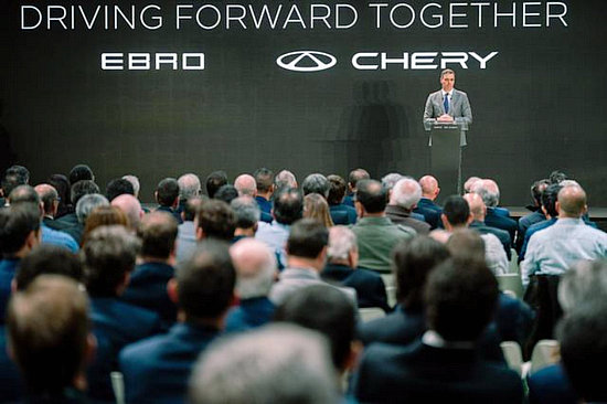 4月19日,在西班牙巴塞羅那自由貿(mào)易區(qū),西班牙首相桑切斯出席中國奇瑞汽車公司與西班牙埃布羅公司電動汽車合作協(xié)議簽字儀式時致辭。新華社發(fā)(胡安·戈薩攝)