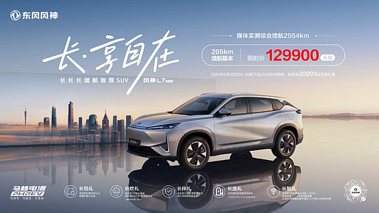 不僅如此,東風(fēng)風(fēng)神L7還帶來驚喜不斷的購車權(quán)益,為2024年6月30日24:00前下定的鎖單用戶,提供至高30999元五重禮遇,助力用戶開啟更加美好的擁車生活:長悅禮:至高享價值10000元配置升級大禮包;長歡禮:全系享5000元置換或至高8萬2年金融免息支持(置換或金融二選一);長伴禮:全系享10年不限里程質(zhì)保和三電終身質(zhì)保;長逸禮:購車送充電樁及免費安裝服務(wù)( 限205Pro/Plus/Max定制版車型);長智禮:全系享5年免費娛樂流量(2G/月),基礎(chǔ)服務(wù)+OTA升級流量免費,205續(xù)航車型額外贈送12個月(8G/月)娛樂流量。