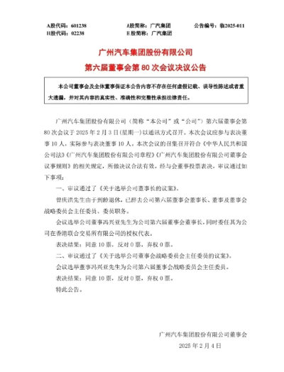據(jù)廣汽集團(tuán)官方消息,2025年2月3日,廣州集團(tuán)第六屆董事會第80次會議于以通訊方式召開。會議審議通過了《關(guān)于選舉公司董事長的議案》。曾慶洪先生由于到齡退休,已辭去公司第六屆董事會董事長、董事及董事會戰(zhàn)略委員會主任委員、委員職務(wù)。公司董事會對曾慶洪先生在任職期間為公司發(fā)展所做的卓越貢獻(xiàn)表示衷心的感謝。會議選舉公司董事馮興亞先生為公司第六屆董事會董事長。