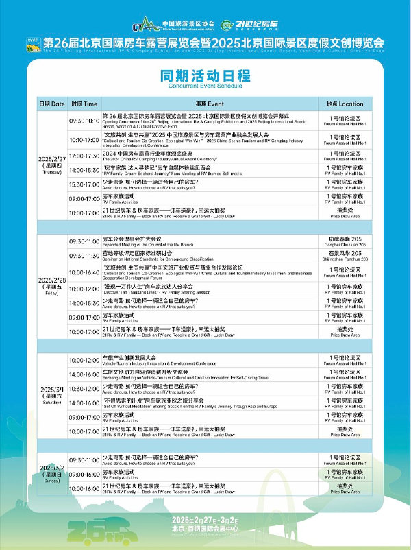 與此同時,展會期間將有一系列精彩紛呈的活動將輪番上演。行業(yè)發(fā)展大會、行業(yè)論壇、技術(shù)研討會和新品發(fā)布會等活動,與會嘉賓們將共同探討房車露營和景區(qū)度假文創(chuàng)產(chǎn)業(yè)的未來發(fā)展趨勢和市場新機(jī)遇,為行業(yè)的持續(xù)健康發(fā)展提供寶貴的建議和思考。