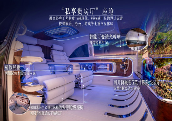 Vision V 概念車重新定義豪華空間,營(yíng)造“私享貴賓廳”般的座艙體驗(yàn)。智能可變透光玻璃將乘客艙與駕駛艙分隔,可在毫秒間實(shí)現(xiàn)透明度的無(wú)級(jí)調(diào)節(jié),營(yíng)造自由、私密的駕乘空間。水晶白色Nappa皮飾與白色絲光綢緞,和大面積開孔胡桃木飾件形成鮮明對(duì)比,格調(diào)優(yōu)雅。頭等艙級(jí)座椅靈感源自優(yōu)雅經(jīng)典的休閑躺椅,采用未來(lái)主義設(shè)計(jì)風(fēng)格,多種調(diào)節(jié)模式為乘客提供極致呵護(hù),甚至可調(diào)節(jié)至舒適的平躺展開。兩側(cè)木質(zhì)飾板內(nèi)嵌精致展柜,為個(gè)人物品提供收納空間,雙獨(dú)立座椅之間的中控臺(tái)同樣設(shè)計(jì)為精致展柜,集成可折疊桌板,桌板展開后呈現(xiàn)為一塊精致的國(guó)際象棋棋盤,致敬經(jīng)典之美。