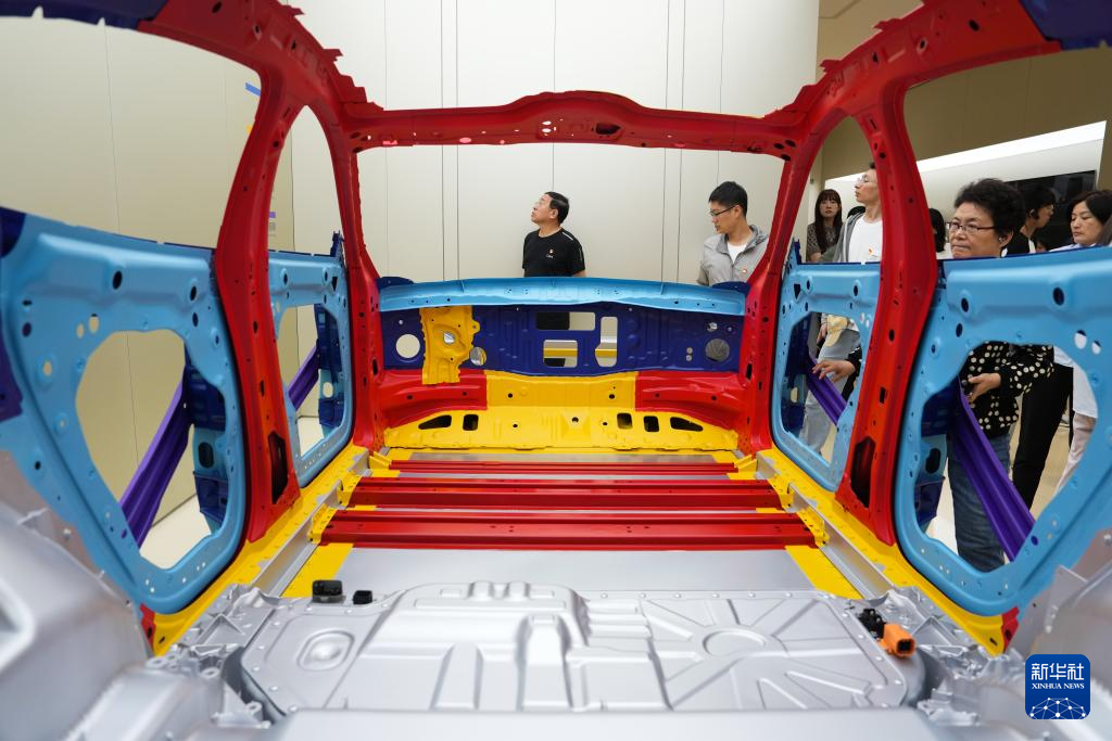 6月16日,參觀(guān)者在北京小米汽車(chē)工廠(chǎng)的科技展廳了解小米汽車(chē)鎧甲籠式鋼鋁混合車(chē)身。新華社記者 鄭煥松 攝