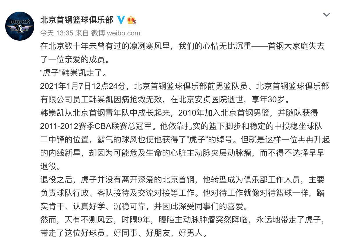 新華網成都1月8日電(王夢 刁文靜)8日,北京首鋼籃球俱樂部官方微博發(fā)布消息,2021年1月7日12點24分,俱樂部前男籃隊員、北京首鋼籃球俱樂部有限公司員工韓崇凱因病搶救無效逝世,享年30歲。