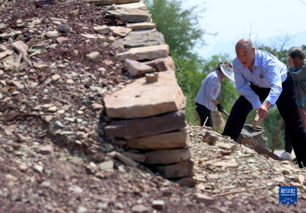 在林州市任村鎮(zhèn)盤龍山村,王生有(前)帶領村民清理亂石,維護道路(2019年7月3日攝)。新華社記者 李安 攝