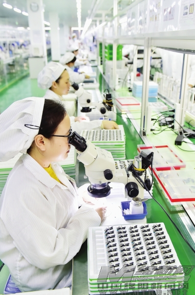 安和精密微型馬達(dá)生產(chǎn)線上,工作人員在顯微鏡下操作