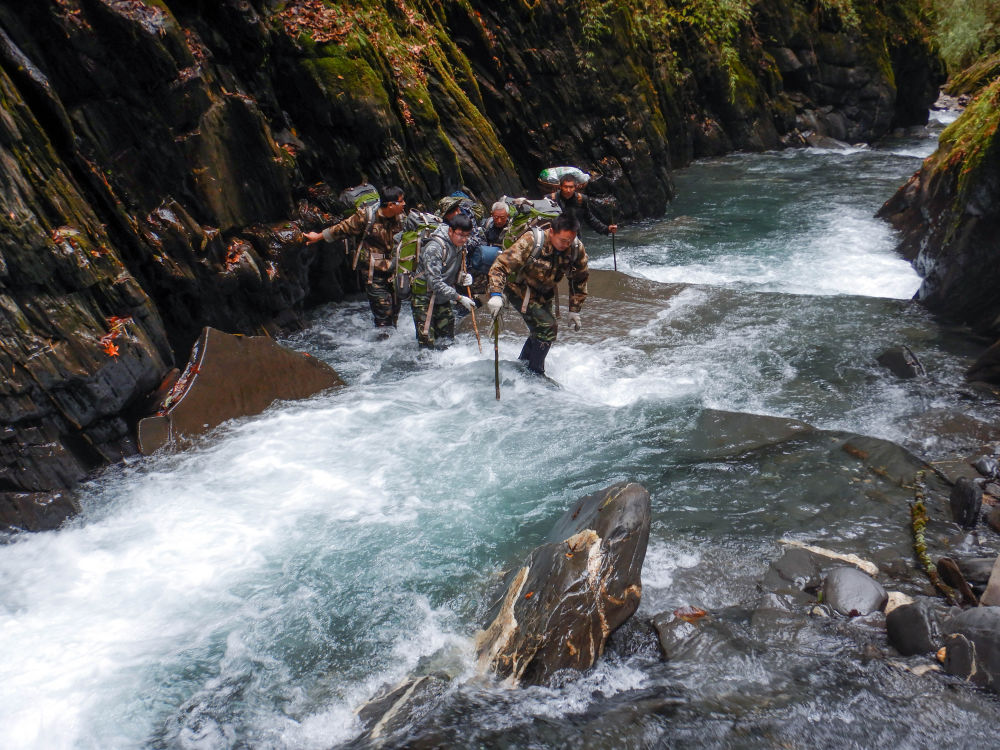 大熊貓國家公園北川小寨子溝片區(qū)的巡護隊員們在野外跋山涉水(2018年11月10日攝)。 新華社發(fā)
