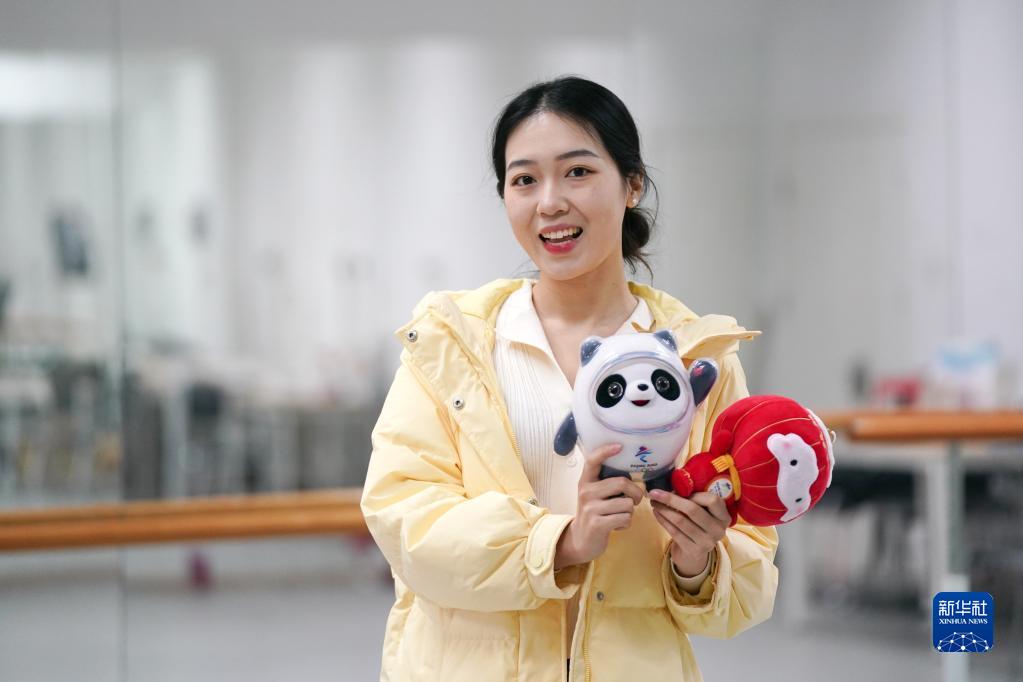 北京郵電大學(xué)的學(xué)生志愿者曹夢鴿手捧北京2022年冬奧會(huì)和冬殘奧會(huì)吉祥物做自我介紹(12月15日攝)。