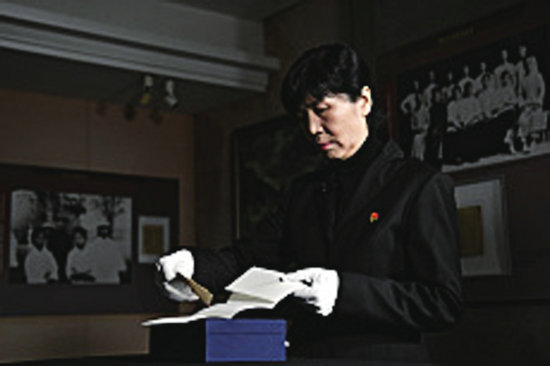 周恩來鄧穎超紀(jì)念館陳列保管部副主任李勤從一個藍(lán)色小箱子中拿出列席證(2020年12月23日攝)。