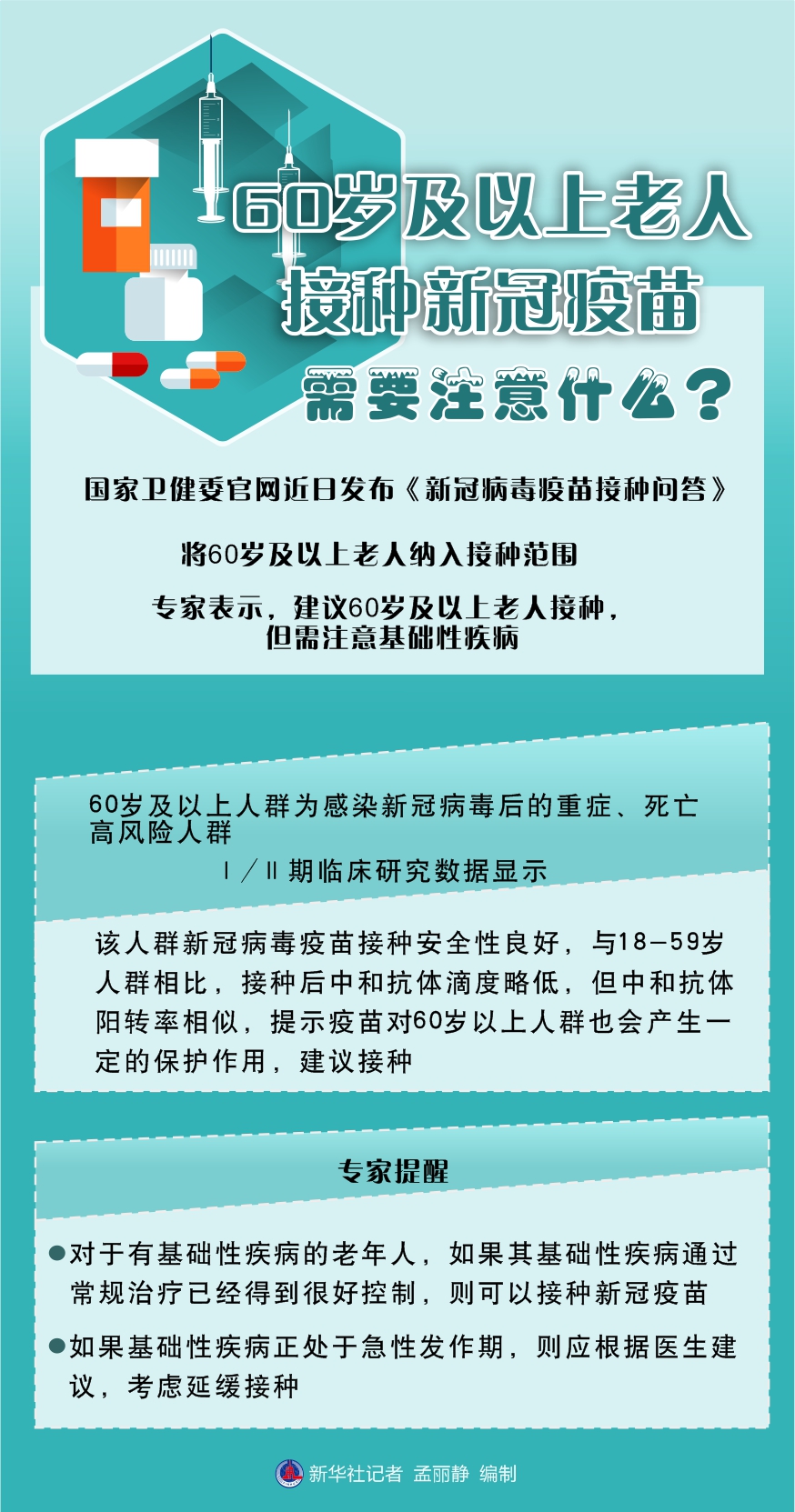 新華社北京4月7日電(徐鵬航)國家衛(wèi)健委官網(wǎng)近日發(fā)布《新冠病毒疫苗接種問答》,明確現(xiàn)階段,我國新冠病毒疫苗的接種對象為18周歲及以上人群,將60歲及以上老人納入接種范圍。60歲以上老人接種新冠病毒疫苗效果如何?需要注意什么?專家表示,建議接種,但需注意基礎(chǔ)性疾病。