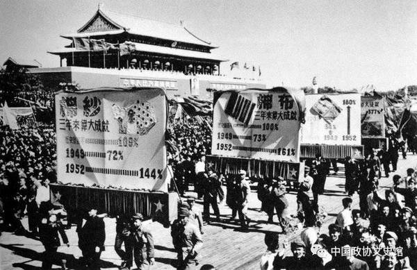 1952年國(guó)慶節(jié),展示國(guó)民經(jīng)濟(jì)恢復(fù)發(fā)展成果的游行隊(duì)伍。(圖片源自中國(guó)政協(xié)文史館)