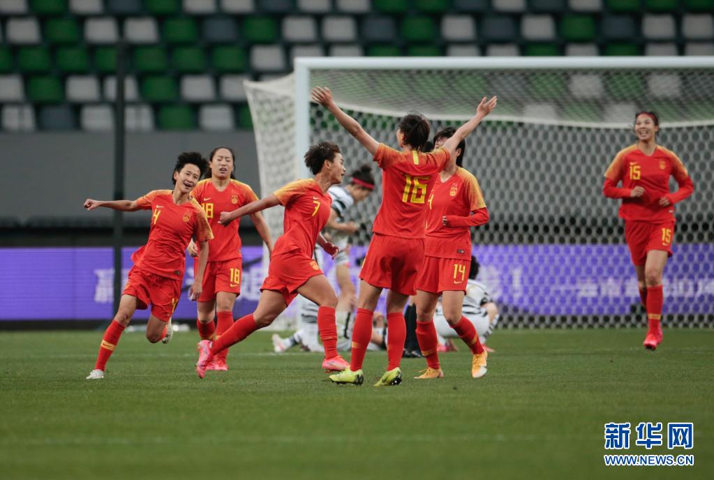 4月13日,中國(guó)隊(duì)球員王霜(中)在比賽中慶祝進(jìn)球。