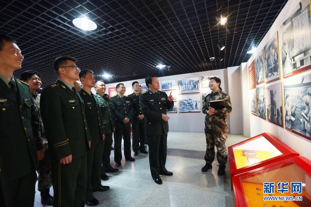 全軍黨史學(xué)習(xí)教育宣講團(tuán)成員、海軍航空大學(xué)教授易春秋(右一)與西藏軍區(qū)官兵在軍區(qū)軍史館一起交流學(xué)習(xí)(3月23日攝)。新華社發(fā)(陶云波 攝)
