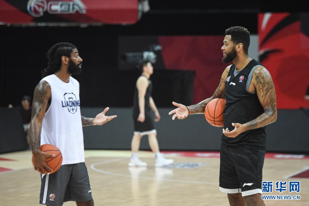 4月29日,遼寧本鋼隊(duì)球員泰勒(右)與梅奧在訓(xùn)練中交流。