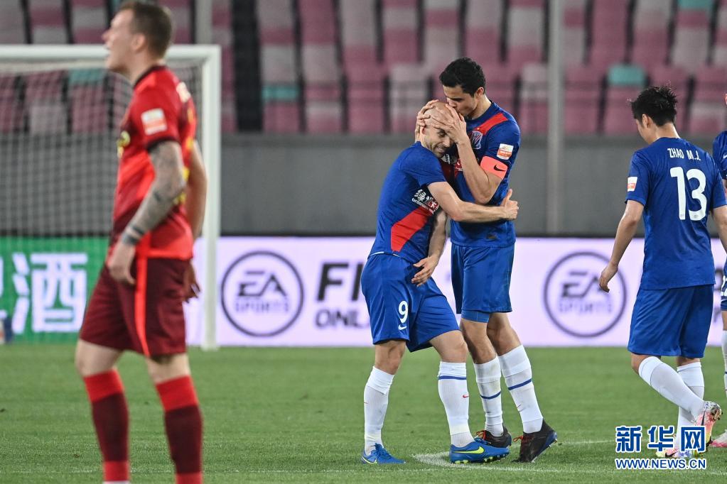 5月10日,上海申花隊球員阿德里安(左二)在比賽中和隊友莫雷諾慶祝進球。