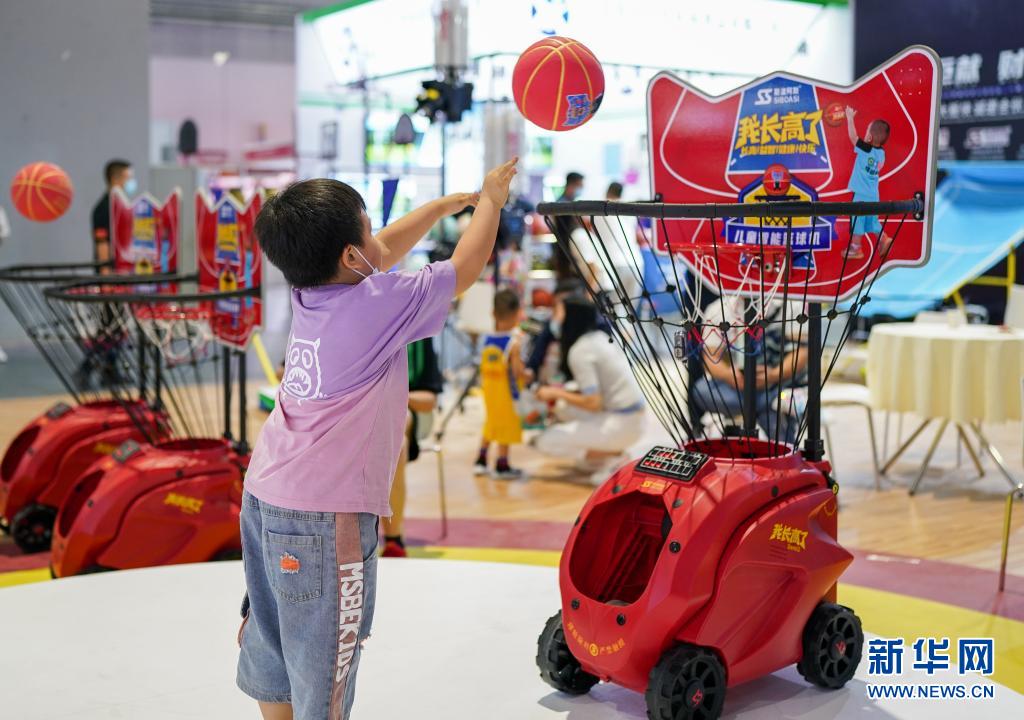 5月19日,小朋友在博覽會(huì)現(xiàn)場(chǎng)體驗(yàn)一款籃球設(shè)備。