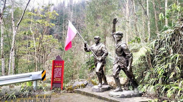 從村委會出發(fā),沿途可見“當(dāng)紅軍光榮”等標(biāo)語,“不怕犧牲、前赴后繼、勇往直前”等紅軍精神大字也隨處可見。在蜿蜒陡峭的坡道彎處,還立有“籌運軍糧、積極參戰(zhàn)、三軍會師、不菲成果”等主題雕塑。