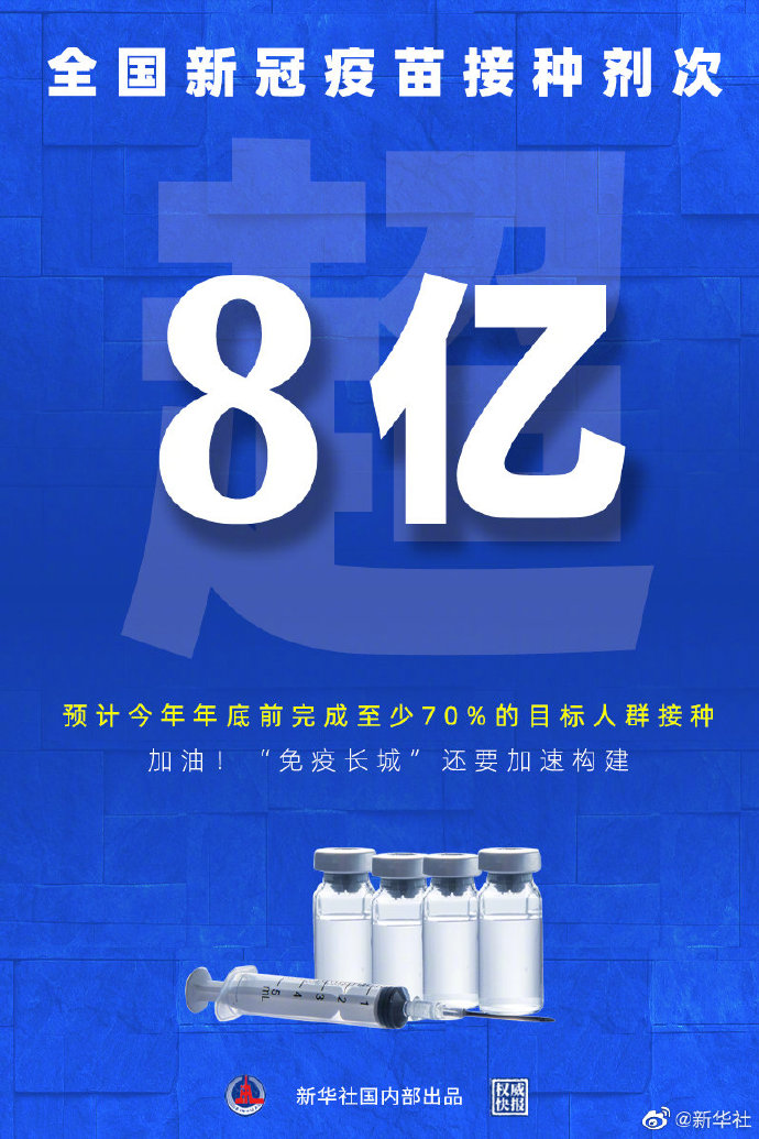 國家衛(wèi)健委6月9日通報(bào),全國新冠疫苗接種已超過8億劑次,免疫屏障正在加速構(gòu)建。國家衛(wèi)健委負(fù)責(zé)人近日接受新華社記者專訪時(shí)表示,預(yù)計(jì)年底前至少70%目標(biāo)人群接種疫苗。共筑“免疫長城”,我們還要繼續(xù)努力。(徐鵬航、陳席元;海報(bào)設(shè)計(jì)張晨光) ????