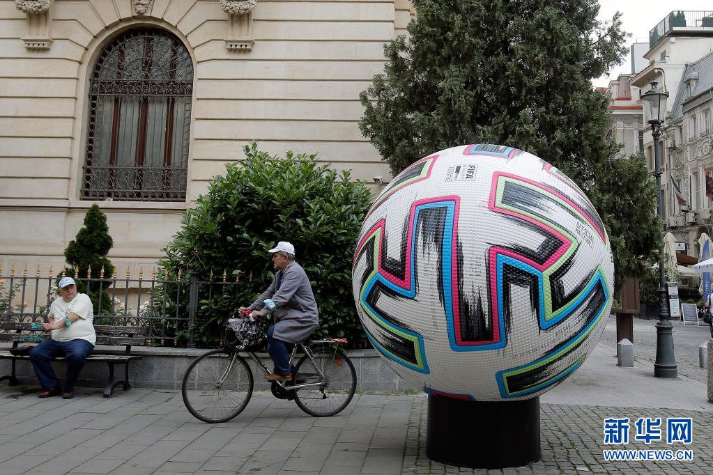 6月10日,在羅馬尼亞首都布加勒斯特,一個巨型歐錦賽足球模型矗立在市中心老城區(qū)步行街上。