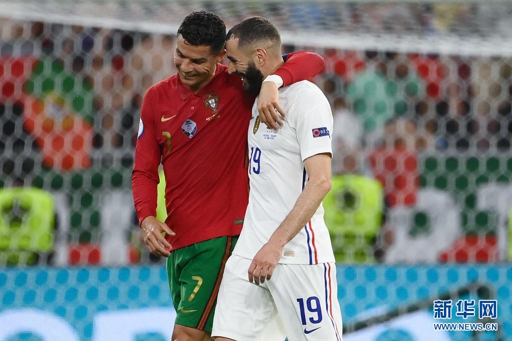 6月23日,葡萄牙隊球員克·羅納爾多(左)與法國隊球員本澤馬在上半場結束后離場。