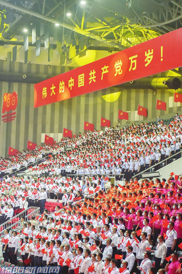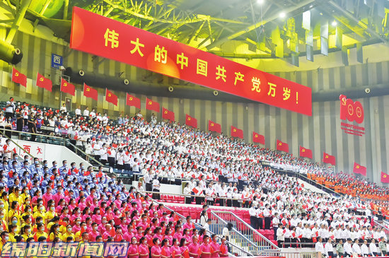 6月30日,九洲體育館內(nèi),黨旗飄飄,歌聲嘹亮,“奮斗百年路·放歌新時代”綿陽市慶祝中國共產(chǎn)黨成立100周年歌詠會在此舉行。