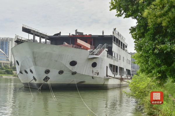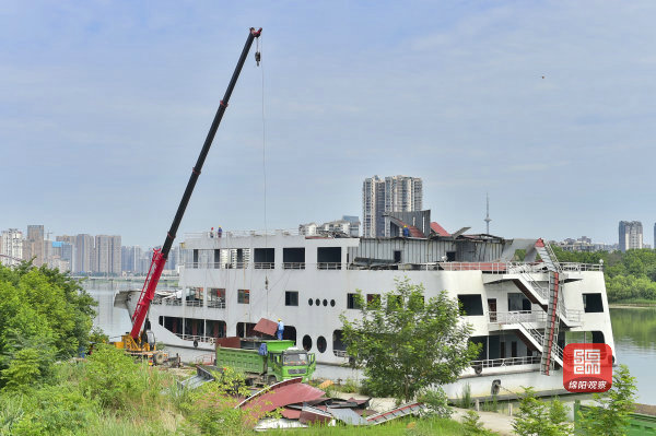 綿陽新聞網(wǎng)訊 7月4日上午,位于綿陽南山公園與桃花島大橋中間水域一側(cè)岸邊,金屬的撞擊聲和正在作業(yè)的大型吊車吸引了過路市民。“這艘船要拆了,從船體建好到現(xiàn)在,都好幾年了一直就沒見用過。”市民趙先生說,全部拆除估計要花幾天時間才能完成。