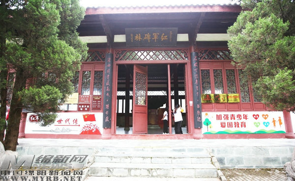 在平武縣北山公園內(nèi),有一座仿古式建筑,高大的臺基,朱紅色的門柱和窗戶,配以純白色的外墻,顯得格外莊嚴肅穆,這就是平武紅軍碑林館,里面保存著很多紅軍的石刻標語。
