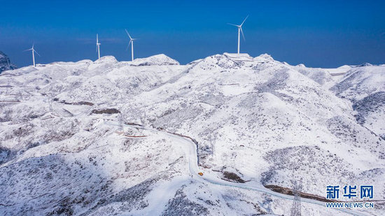 雪后的六盤水市盤州四格風(fēng)電場(1月12日攝,無人機照片)。新華社記者 陶亮 攝