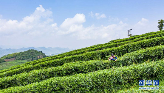 在貴州省六盤水市六枝特區(qū)落別鄉(xiāng),茶農(nóng)在采茶(4月20日攝,無人機照片)。新華社記者 陶亮 攝
