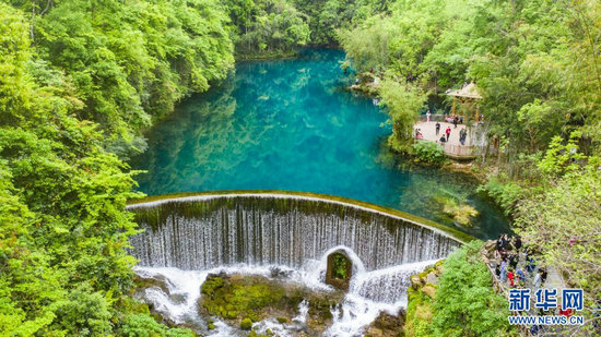 游客在荔波縣小七孔景區(qū)游玩(4月15日攝,無人機照片)。新華社記者 陶亮 攝