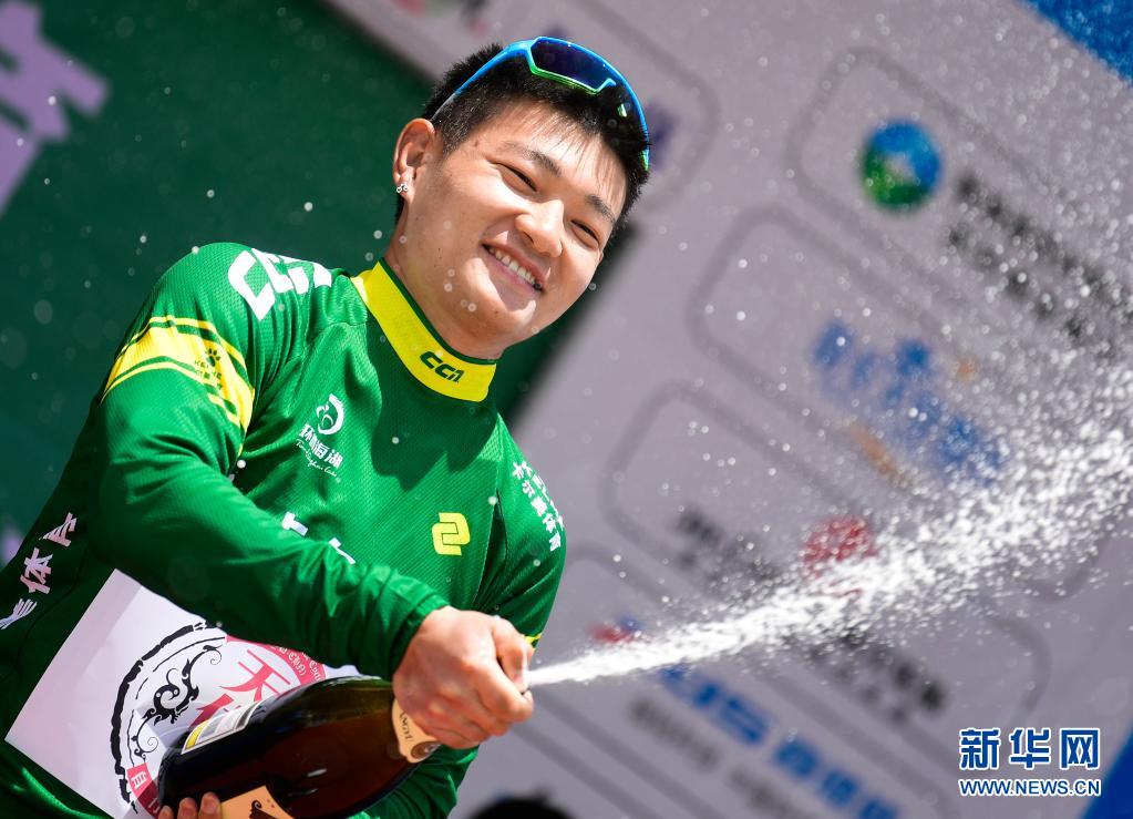 7月15日,青海天佑德車隊(duì)選手李自森身著代表沖刺總積分第一名的綠衫在領(lǐng)獎(jiǎng)臺上噴灑香檳慶祝。