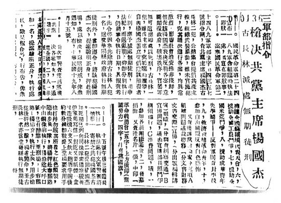 槍殺楊國杰的新聞報道(翻拍自黨史資料)