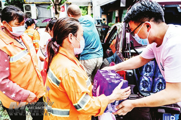 志愿者將準備好的礦泉水、毛巾、花露水、藿香正氣水等各類物資,送到了環(huán)衛(wèi)工手上,并向他們表達真誠的敬意,叮囑他們在炎熱的夏日,一定要注意防暑降溫。