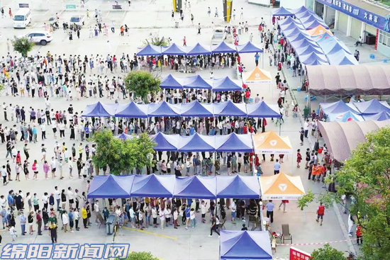在經(jīng)開區(qū)美食廣場的核酸檢測點(diǎn)現(xiàn)場,綿陽市三醫(yī)院派出近400人次連續(xù)奮戰(zhàn)了兩天一夜,截至7月25日22:00已累計采集樣本69095個,平均每小時采樣1919.3個!