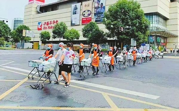 8月7日,成都一家大型超市的配送員給隔離小區(qū)的住戶運(yùn)送生活物資。159名工作人員堅(jiān)守超市14天,為隔離小區(qū)的1100戶3000多人提供安全、新鮮、健康的生活必需品。每位配送員幾乎每天都要步行30000多步,很多人腳都走腫了。