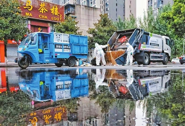8月6日清晨5點(diǎn),環(huán)衛(wèi)工人對(duì)成都市優(yōu)品道封控區(qū)的垃圾進(jìn)行清運(yùn)。每一袋垃圾他們都會(huì)先進(jìn)行消殺,再收集,收集完備后消殺員還會(huì)對(duì)垃圾點(diǎn)位進(jìn)行消殺。