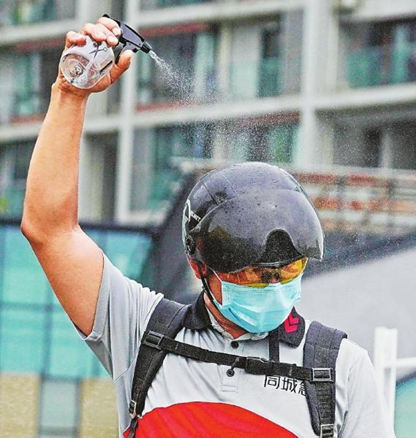 8月11日,成都市區(qū)閃送員蔡志明正在用酒精給自己和快遞物品消毒。他每天8點(diǎn)出門接單,要一直忙到晚上10點(diǎn)才能收工,為了防疫,他身上常備酒精噴壺,每天最少要噴灑7次。