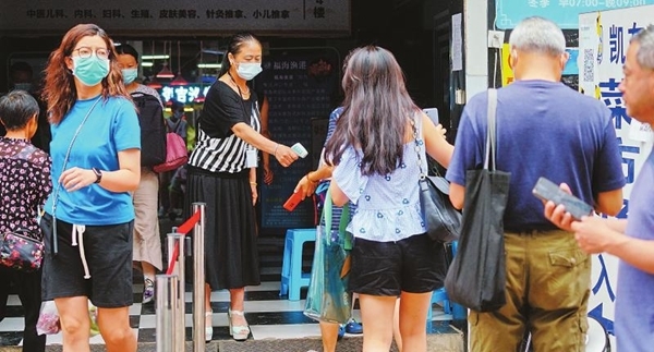 8月14日,成都市成華區(qū)雙福一路凱東農(nóng)貿(mào)市場(chǎng)的菜市場(chǎng)安全員林年芬正在給入場(chǎng)人員檢測(cè)體溫。菜市場(chǎng)人員密集、流動(dòng)性大,屬于防疫工作的重點(diǎn)場(chǎng)所,一個(gè)上午林年芬就要“嘀”800余次體溫槍。