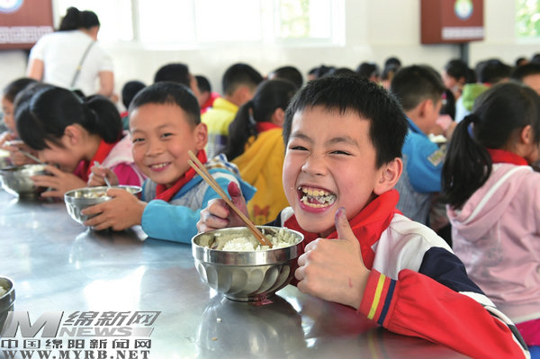 圖為三臺(tái)縣紫河鎮(zhèn)農(nóng)村學(xué)生正在吃免費(fèi)午餐。