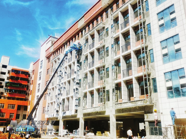 在成綿路小學(xué)改擴(kuò)建工程施工現(xiàn)場,工人正在對外墻進(jìn)行裝飾裝修
