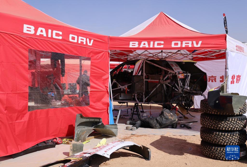 1月8日,北京越野車(chē)隊(duì)技術(shù)人員在利雅得營(yíng)地內(nèi)檢修車(chē)輛。