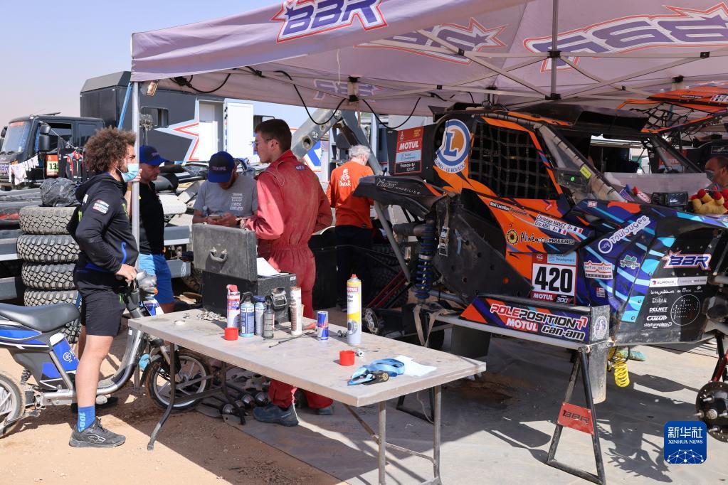 1月8日,BBR車(chē)隊(duì)技術(shù)人員在利雅得營(yíng)地內(nèi)檢修車(chē)輛。