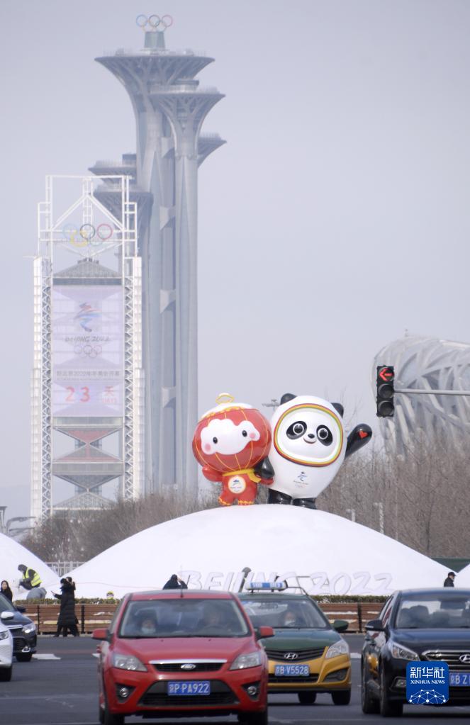 約7.5米高的北京2022年冬奧會和冬殘奧會吉祥物“冰墩墩”“雪容融”日前在位于北京中軸線的奧林匹克景觀大道南端亮相。“冰墩墩”和“雪容融”可愛的造型吸引了路人的目光。