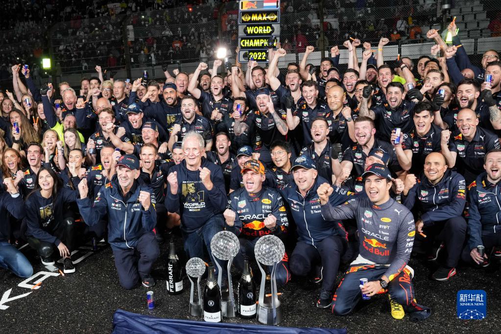 10月9日,紅牛車隊(duì)荷蘭車手維斯塔潘(中)與車隊(duì)合影慶祝。新華社記者 張笑宇 攝